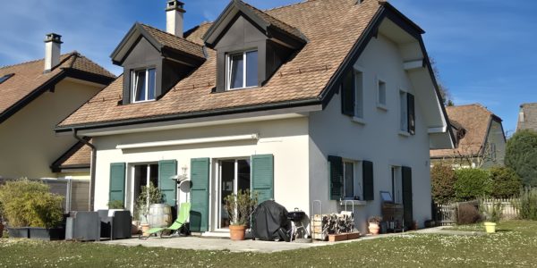 Villa jumelle de 4.5 pièces, séparée par les garages comprenant : Rez : hall d’entrée avec dégagement, grand salon donnant sur ..